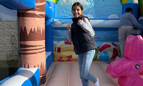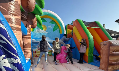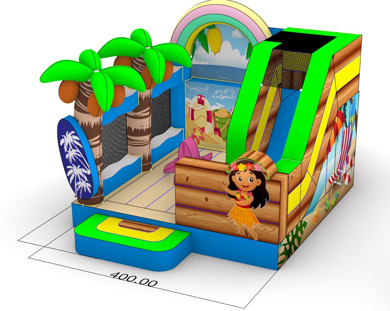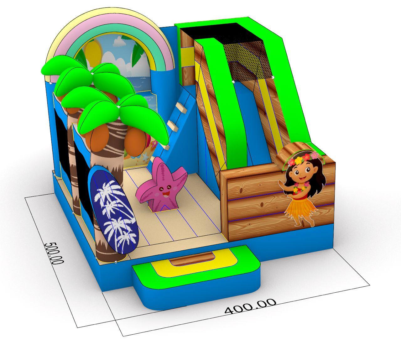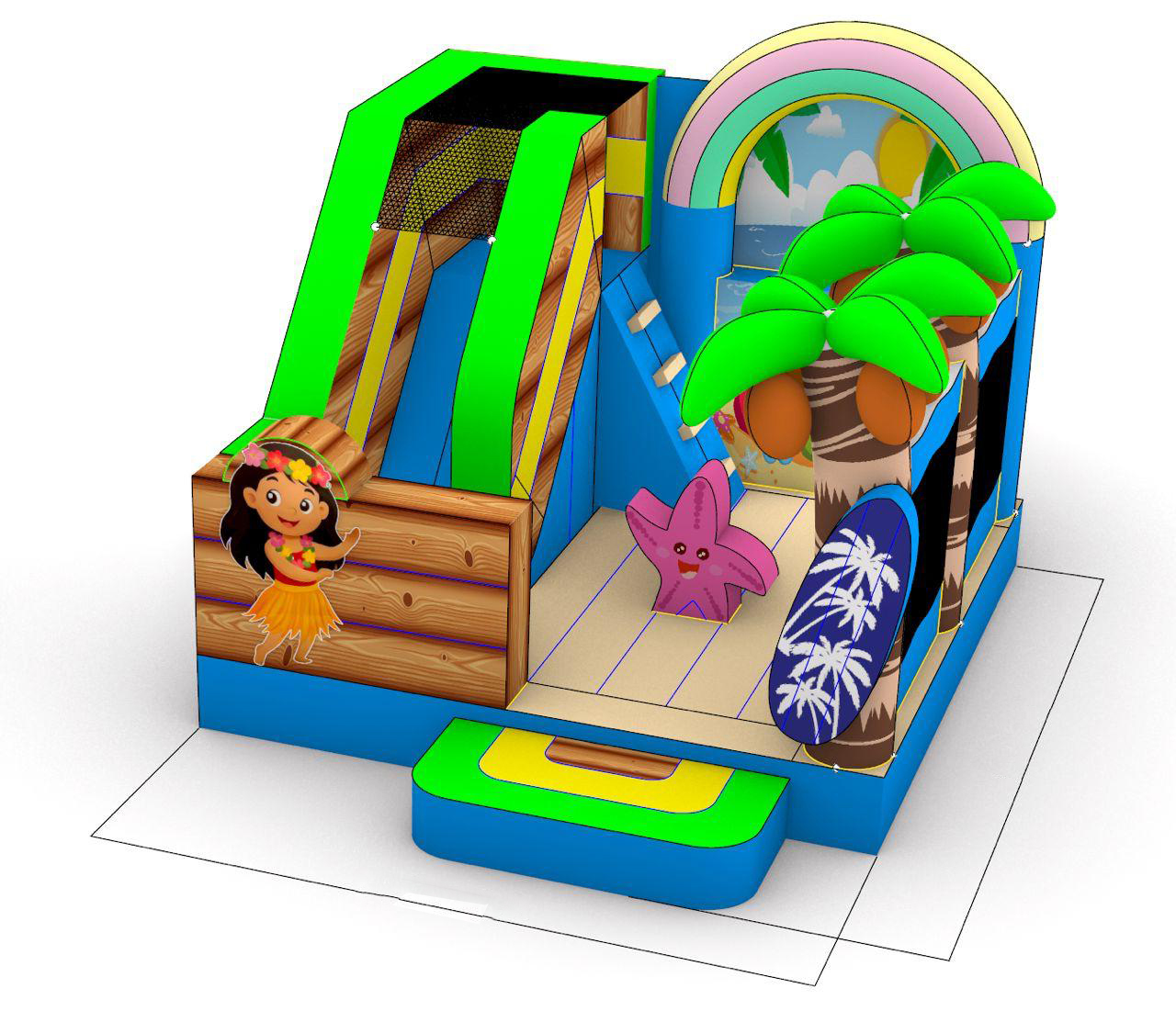 Beach World bringt echtes Strandfeeling auf jedes Fest. Mit ihrer Rutsche, den bunten Palmen und dem Seestern lädt sie Kinder zum Hüpfen, Spielen und Toben ein.